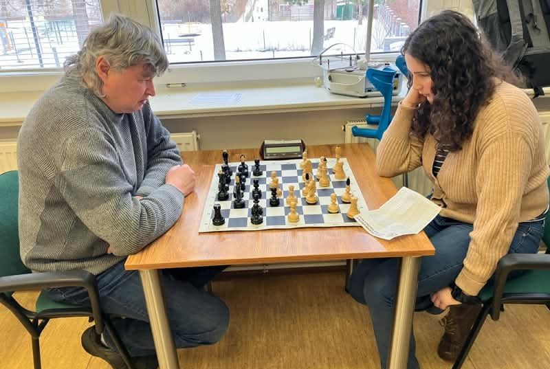 V prvním zápase roku 2026 se náš B tým utkal s vedoucím týmem KP ŠSPM Lipky HK D. A tento tým neváhal přijet ve velmi silném složení s bývalými hráči mnohem vyšších soutěží. Ale ani náš tým nenastupoval jako vyložený outsider. Po čtvrthodině remizoval Buločkin (HK) proti V. Kroulíkovi a Vestfál (HK) proti Horákovi, stav byl 1:1. Zajímavou partii hrála Lada Zelbová proti bývalému olympionikovi Jiřímu Nunovi (na fotografii).