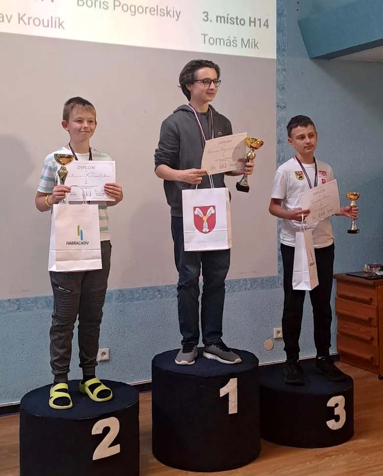 Mistrovství ČR v rapid šachu mládeže se hraje dnes 13. 9. 25 a zítra v Harrachově. Ve hře o titul tam určitě bude dvojice Václav Kroulík - Tomáš Mík, která je na prvních dvou nasazovacích pozicích v H 14. Naději máme i v H12, kde je v první polovině Štěpán Kroulík, ve druhé polovině Adam Kubíček. Pátým želízkem v ohni je Karolína Dvořáková v H10.